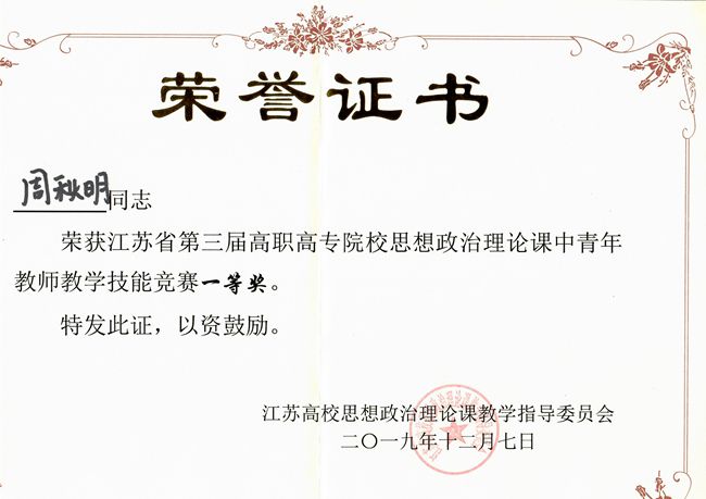12月7日在江苏经贸职业技术学院举办的江苏省第三届高职高专院校思想政治理论课中青年教师教学竞赛结果揭晓,我院周秋明老师喜获《毛泽东思想和中国特色社会主义理论体系概论》组一等奖。