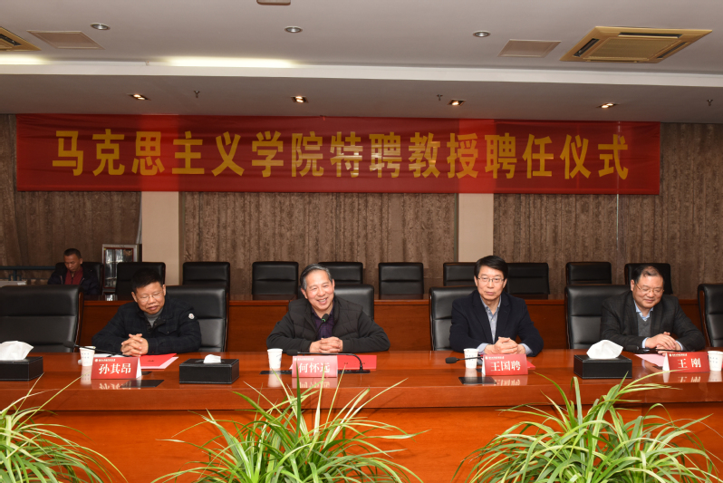 为不断推进思想政治理论课改革创新,加强新时代马克思主义学院建设,2022年3月4日下午,马克思主义学院特聘教授聘任仪式在行政楼辅一楼会议室举行,校党委书记吴学敏、校长谢永华、校党委副书记王伟、人事处及马克思主义学院的领导和部分老师出席,马克思主义学院特聘教授何怀远、孙其昂、王国聘、王刚出席了聘任仪式,聘任仪式由党委副书记王伟主持。