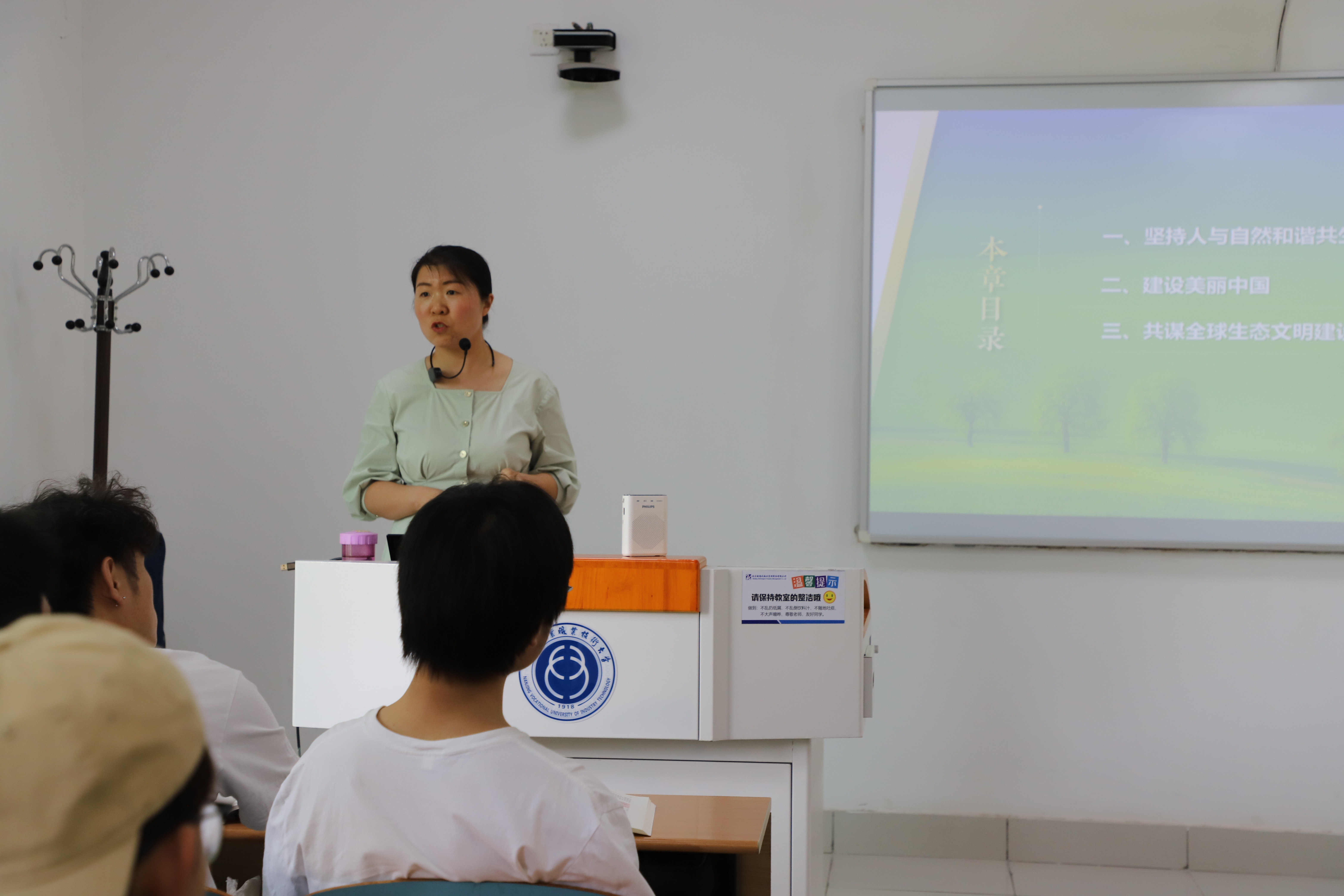 在本期示范课上,张扬老师的授课主题是“建设社会主义生态文明”。张扬老师首先通过向学生提问“全国生态文明日是哪一天”导入该课程,然后张扬老师从“新时代为什么要建设生态文明”“什么是新时代的生态文明”“怎样建设新时代生态文明”三个角度,全面系统深入的阐述了习近平生态文明思想。张扬老师授课精神饱满,语言流畅,逻辑清晰,阐释深入,做到了“理论与实际相结合”,做到了“三贴近”。