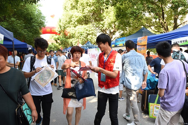 在学校西门、南门、黄炎培广场、学生公寓和羊山公园地铁站等校内外迎新点处处可以看到志愿者们在积极的引导、接待新生和家长,他们细致、周到的服务为广大新生送上了学校团学组织的温暖。此外,今年校学生会还首次采用“学长学姐带你逛校园”+全景航拍网络直播的方式现场报道我校迎新盛况。与此同时,在第十六届大学生社团巡礼节暨科技活动月开幕式现场,72个学生社团开展了丰富多彩的特色品牌活动,特别是基于半导体的汽车空调、3D打印机等科创作品展示以及吉他社动感rap表演、书法协会书法表演,吸引了同学们的驻足参观,现场互动交流气氛热烈,广受新生及家长们的好评。