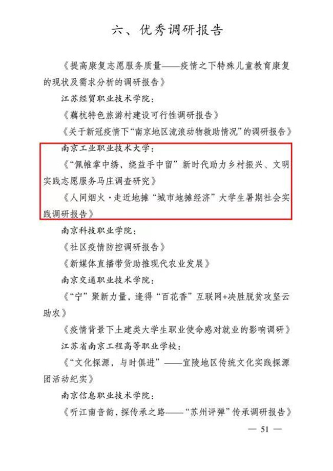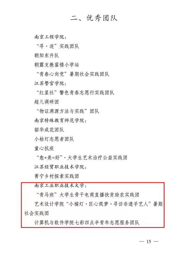 其中,校团委荣获“江苏省先进单位”,学校“青马班”大学生骨干电商直播扶贫助农实践团、艺术设计学院“小橘灯.匠心筑梦.寻访非遗手艺人”暑期社会实践团、计算机与软件学院七彩四点半青年志愿服务团队荣获“江苏省优秀团队”,王润生、魏亮、章民安、华晨四名同学荣获“江苏省先进个人”,杨海丰、杜梦晨、张婉婷三名同志荣获“江苏省先进工作者”,机械工程学院——南京市江宁区横溪街道西岗社区荣获“江苏省优秀社会实践基地”,经济管理学院《“佩帷掌中绣,绕益手中留”新时代助力乡村振兴、文明实践志愿服务马庄调查研究》、商务贸易学院《人间烟火.走近“城市地摊经济”大学生暑期社会实践调研报告》荣获“江苏省优秀调研报告”。