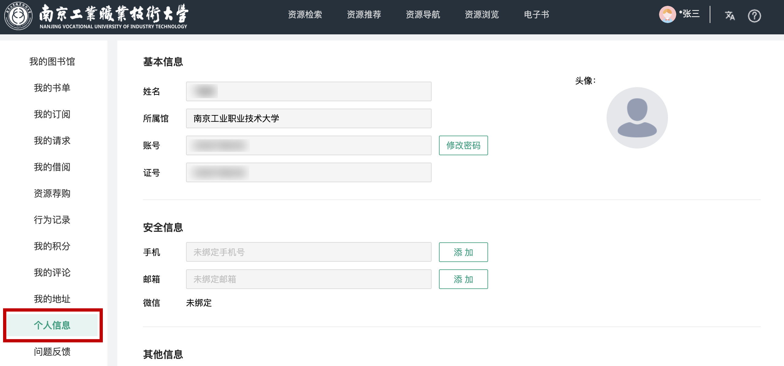 为确保您能正常接收上述提醒消息,需要您在“我的图书馆”中添加手机号和邮箱并进行验证,否则将无法接收图书馆发送的提醒消息。具体操作流程如下: